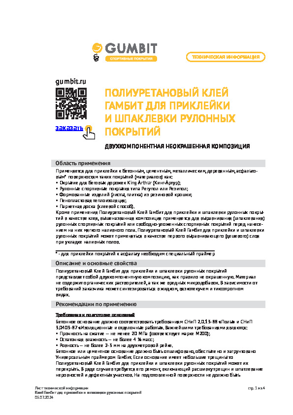 Преимущества полиуретана «Гамбит»:Задействуют состав для приклейки, шпаклевки не только рулонных покрытий, но и покрытий для беговых дорожек, формованных изделий (плитки, листов) из резиновой крошки.